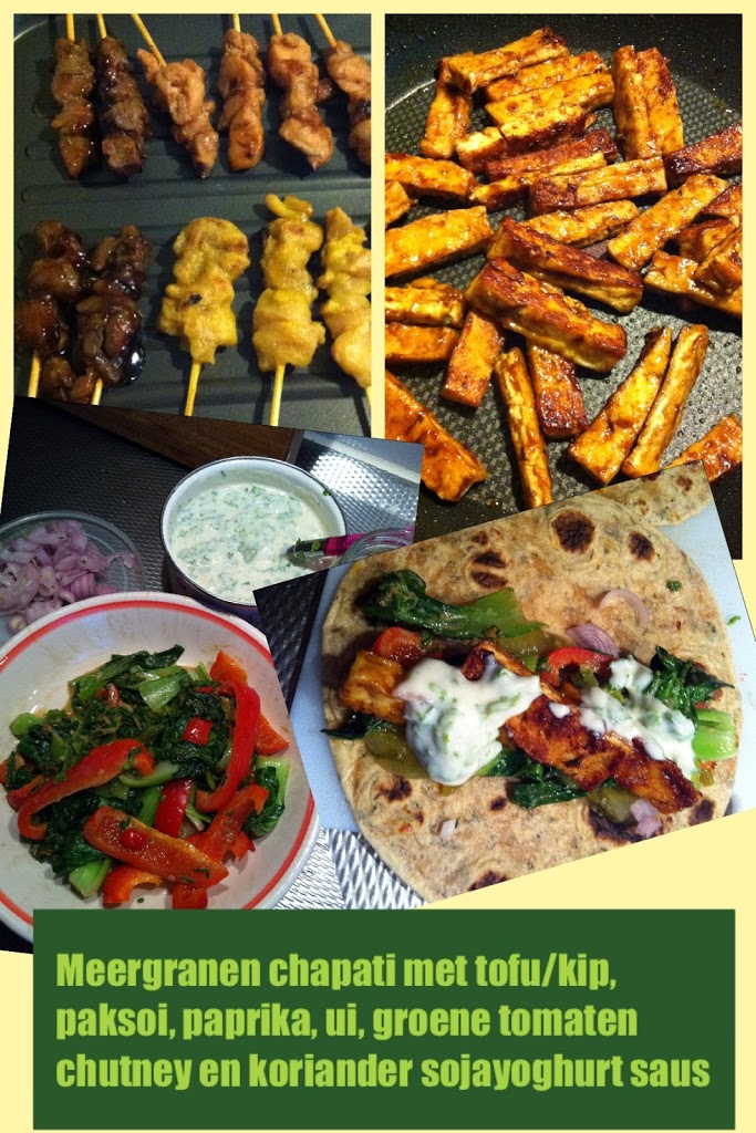 Ik heb de chapati’s gevuld met restjes die ik nog in onze koelkast had liggen en dat was paksoi, paprika, zeekraal (een groente die aan de rand van de zee groeit en daardoor een ziltige smaak heeft, voor flexitariërs een leuke smaakvariant want het smaakt een beetje vissig), gerookte tofu voor mij en gegrilde kip voor mijn mannetje en een yoghurt koriander sausje.
